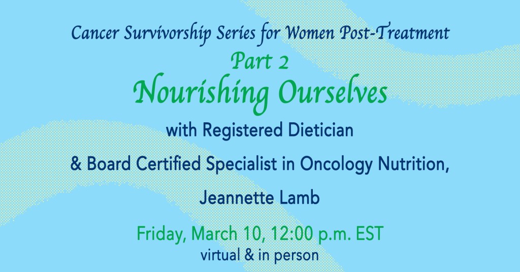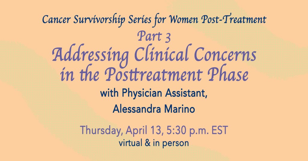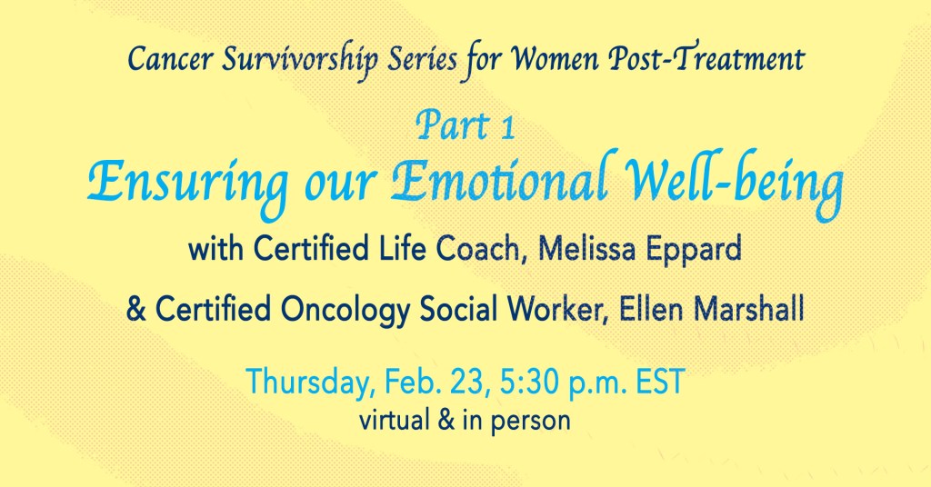 In this session, Ellen and I will explore common concerns that arise after cancer treatment as you find your “new normal.” You are not alone in experiencing feelings of uncertainty, anxiety, fear of recurrence, body image issues along with changes in your sexuality and relationships. Together, we will explore our unique but common challenges and learn coping skills to help navigate this phase of our lives.